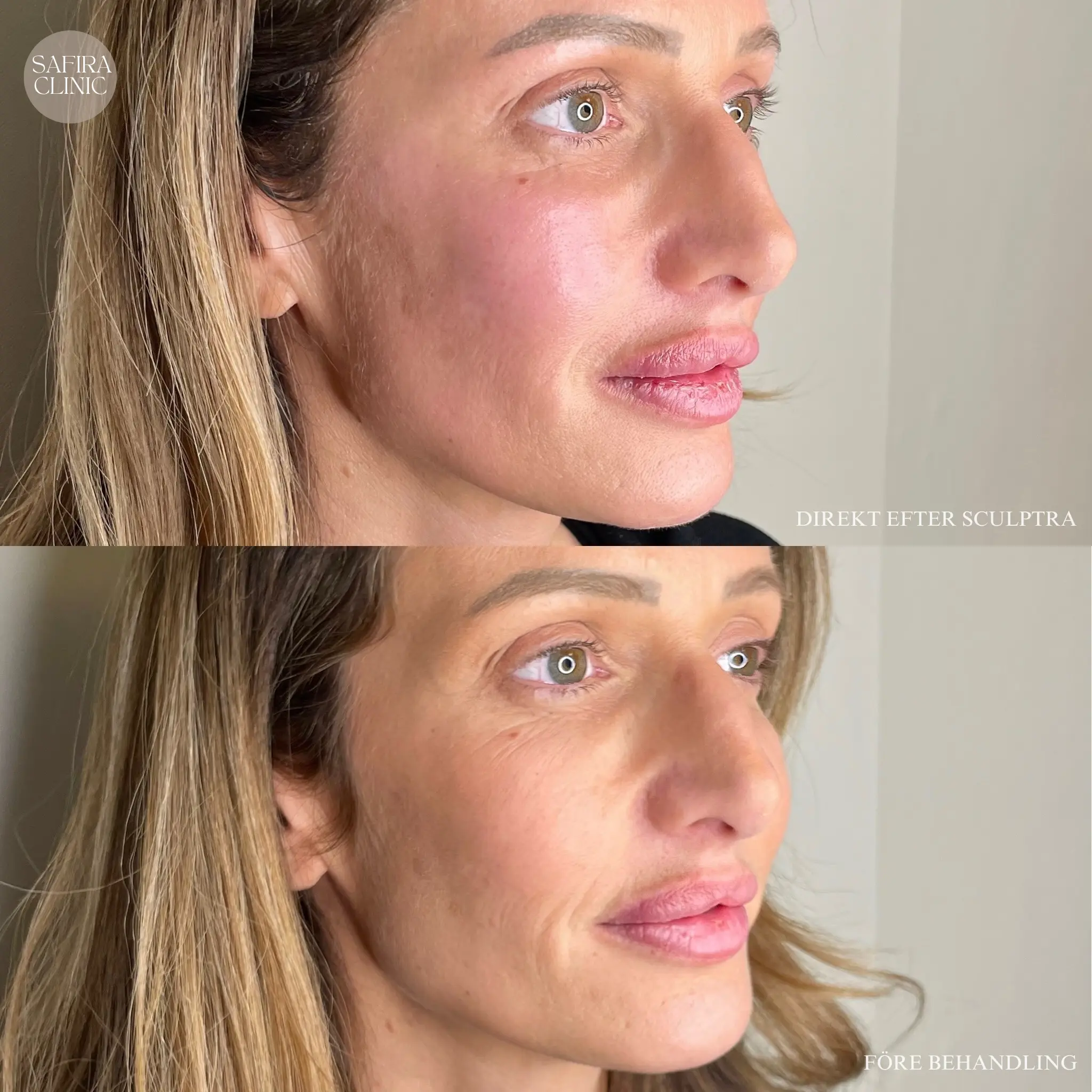 Vi använder bedövningssalva, därefter gör vi ett litet hål vid kinden, och ett vid käkvinkeln. Där går vi in med en trubbig nål (cannula) för minimala blåmärken, mer komfort och smärtfri teknik. Vi blandar Sculptra med bedövningsmedel för att ge dig en bekväm upplevelse. Sculptra läggs i tunna streck i ansiktet. Behandlingen tar ca 30-45 minuter och innebär minimal återhämtningstid.