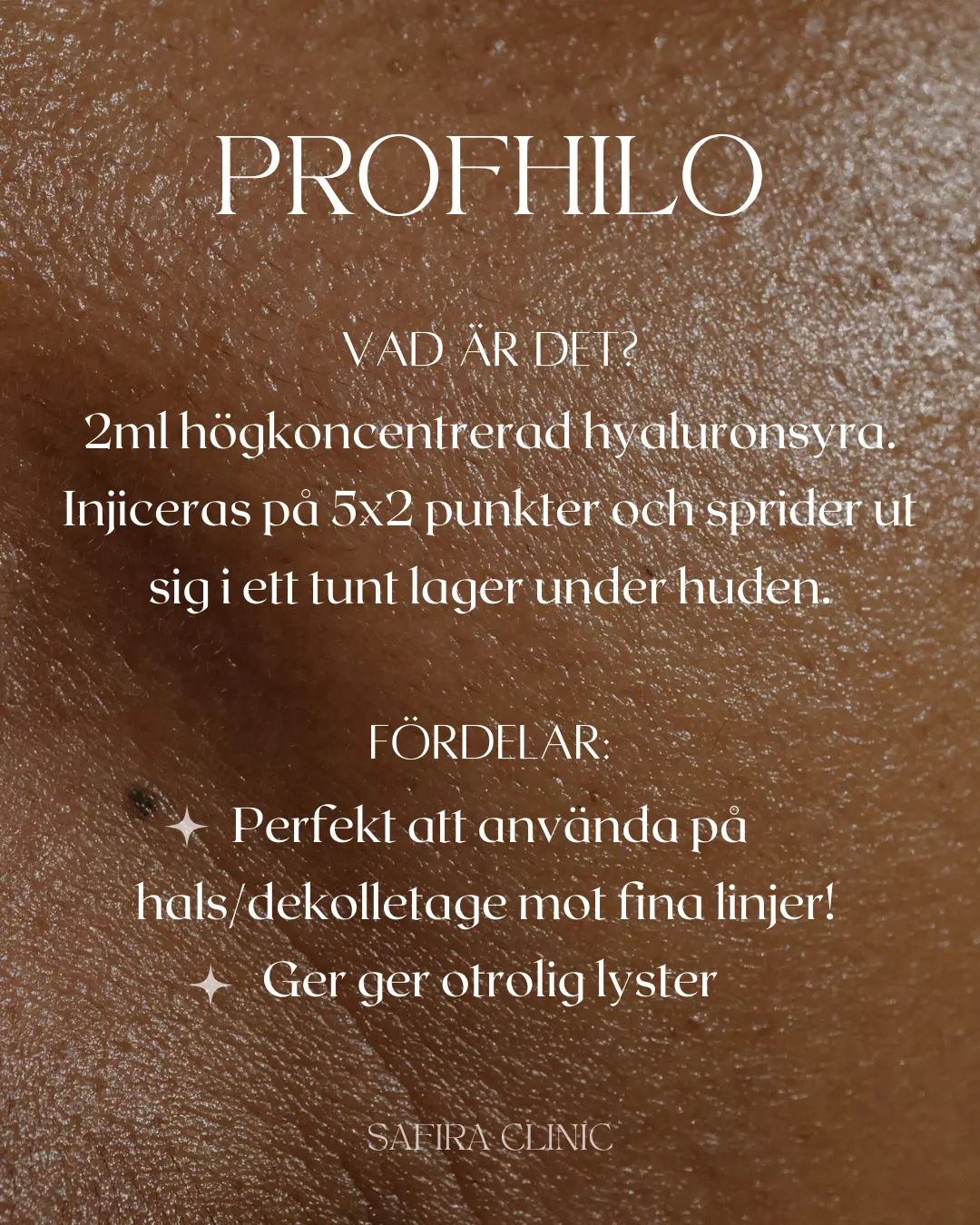- Profhilo – Ger ett naturligt lyft och förbättrar hudens kvalitet på ansikte, hals och händer.